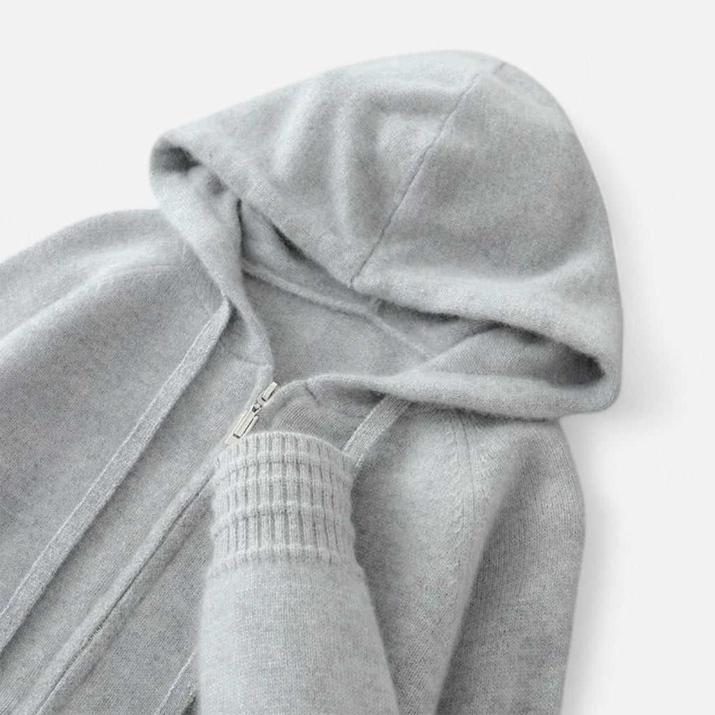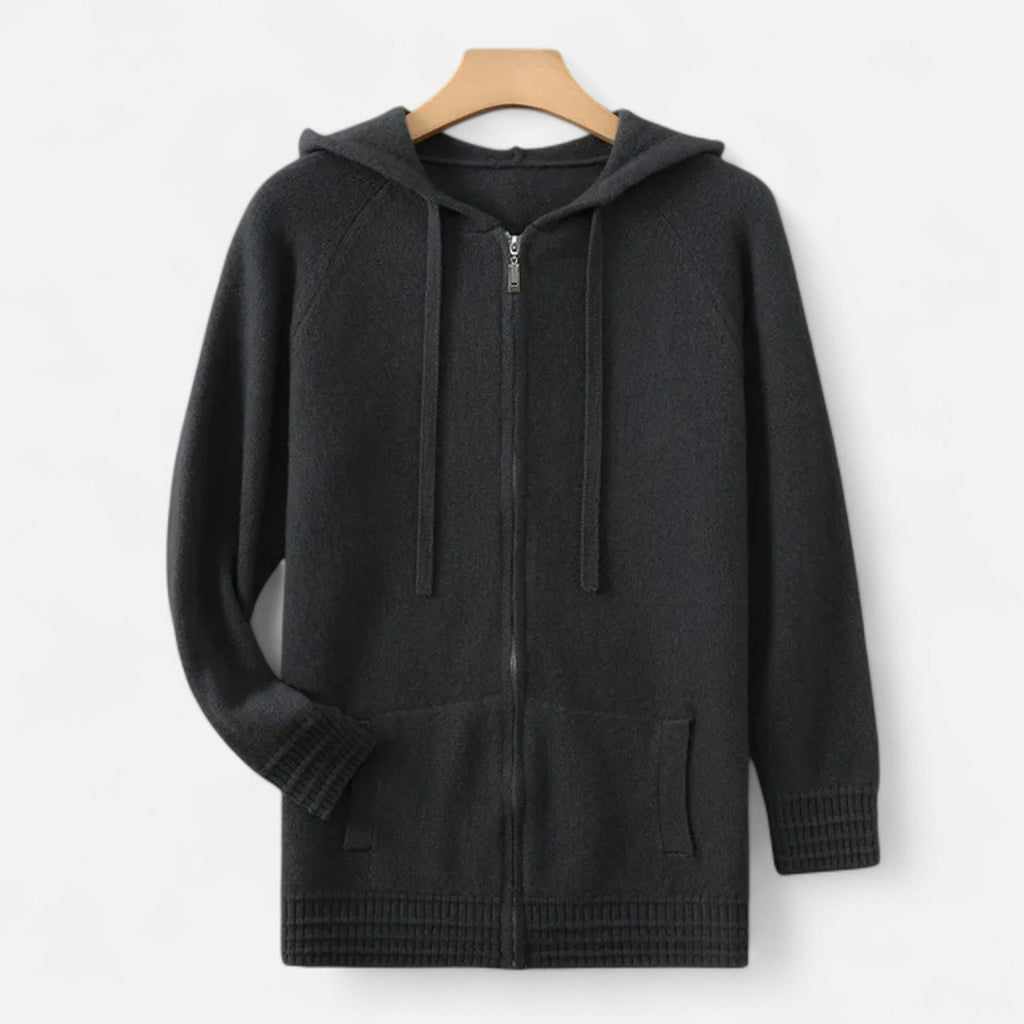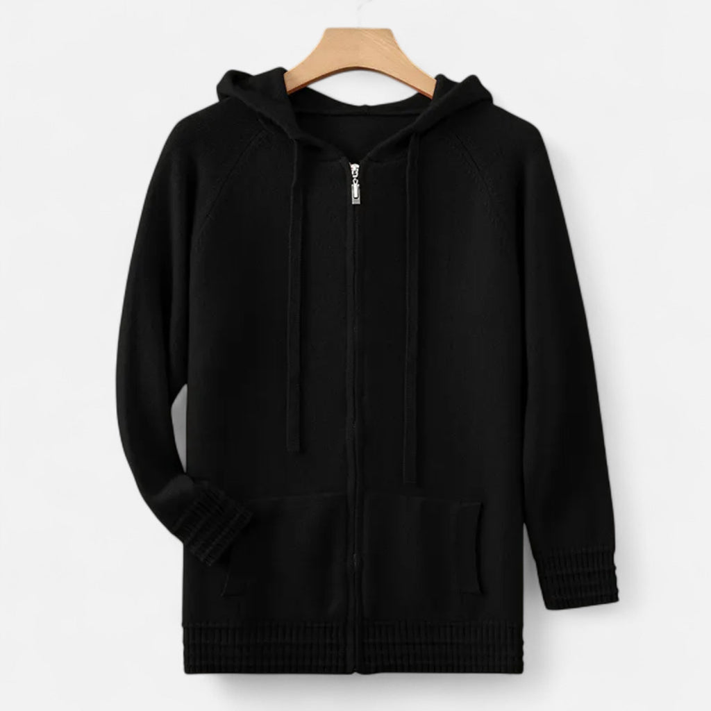 This hooded zip-up knitted cardigan combines a rugged aesthetic with refined detailing. It features a textured knit and a hooded design that give it casual versatility and visual interest.