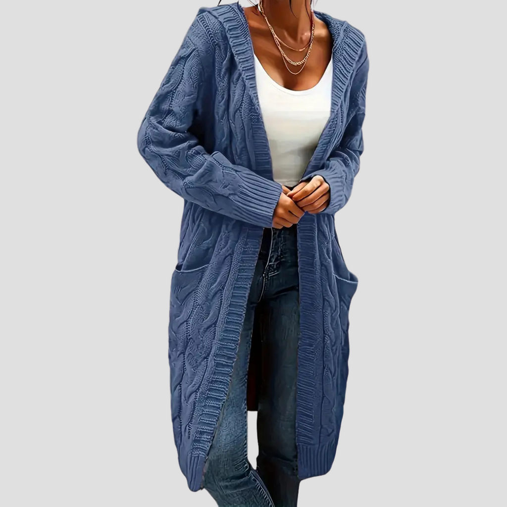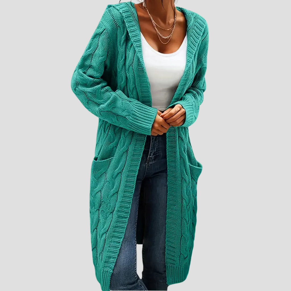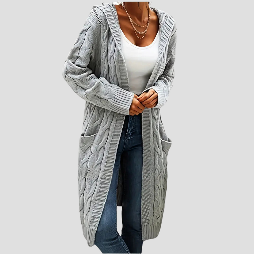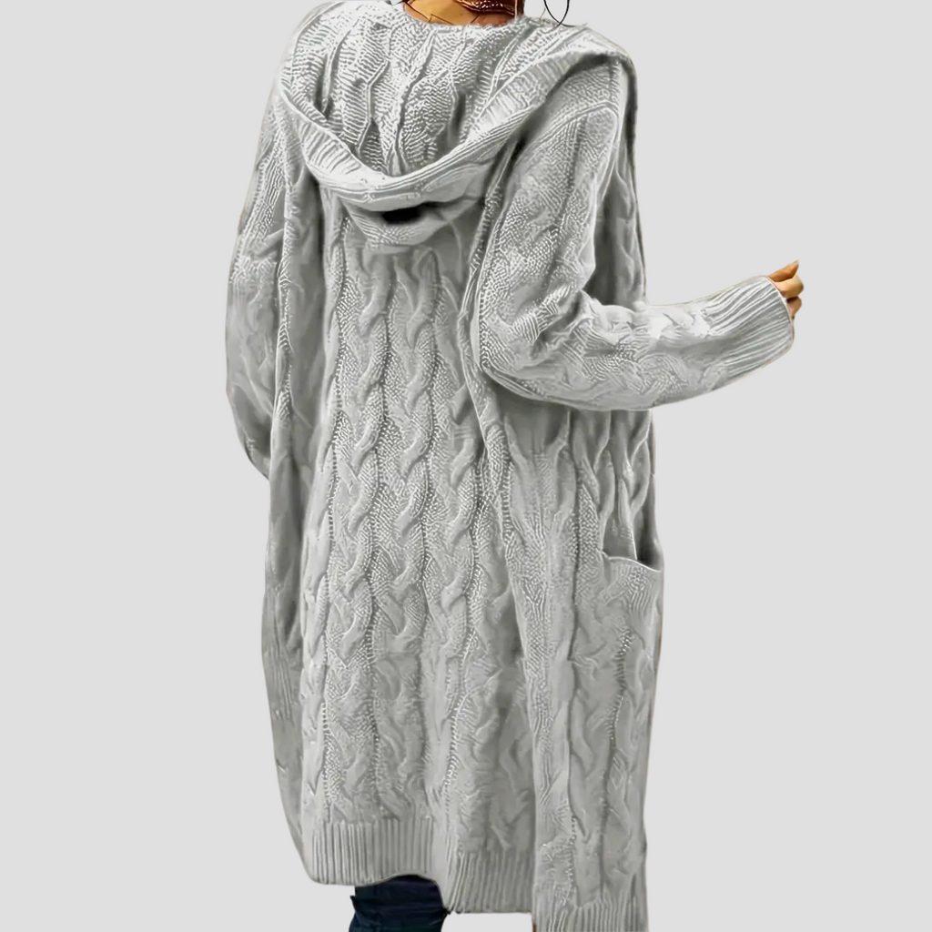 It feels comfortable to wear over shirts, tops, or dresses and provides extra coverage for colder months. Practical details like a hood and pockets add everyday utility without changing the simple lines.