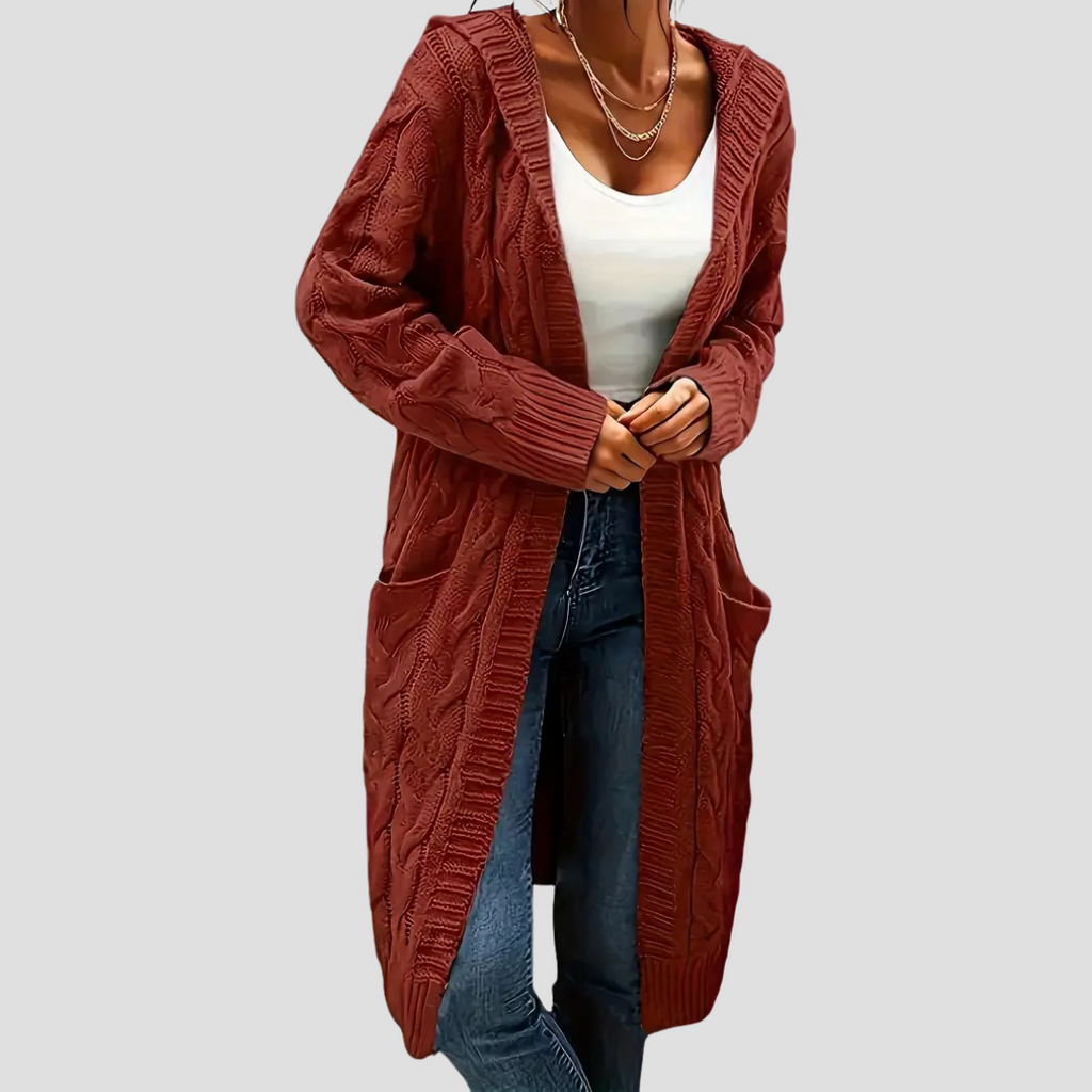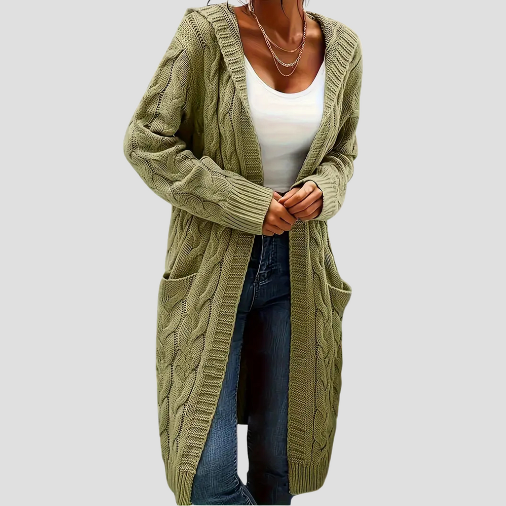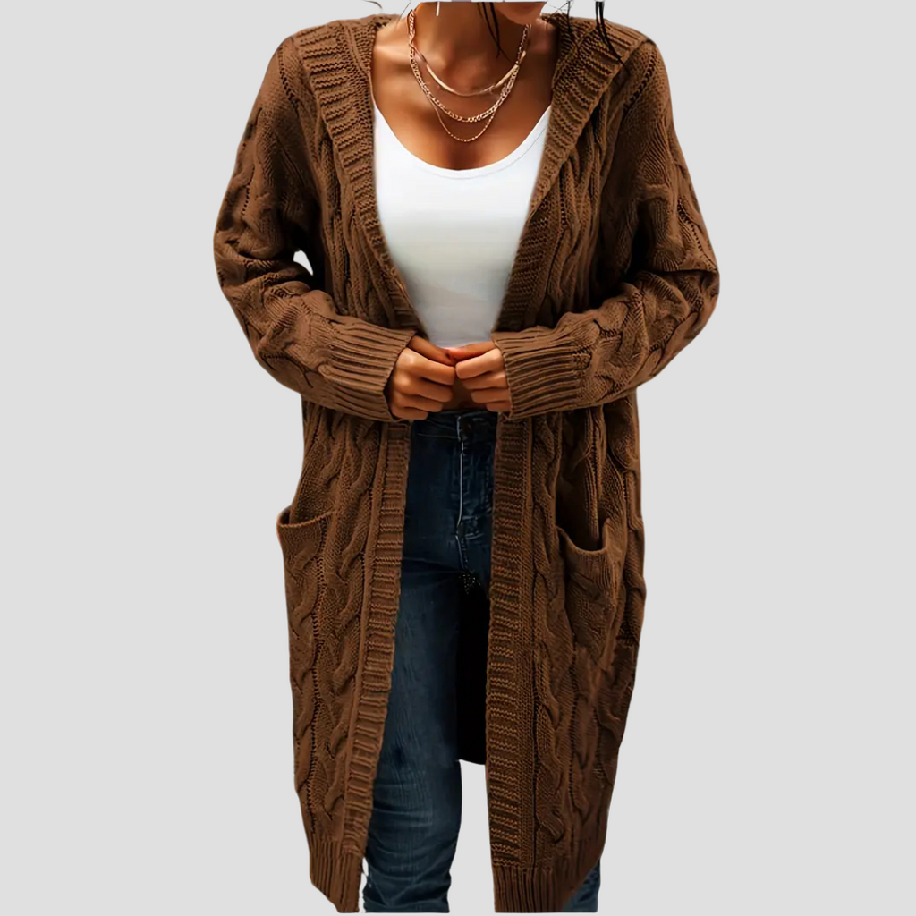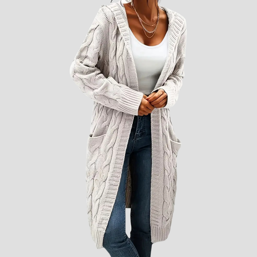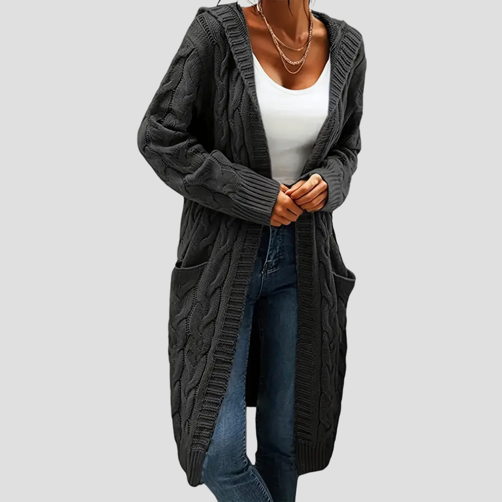 It feels comfortable to wear over shirts, tops, or dresses and provides extra coverage for colder months. Practical details like a hood and pockets add everyday utility without changing the simple lines.