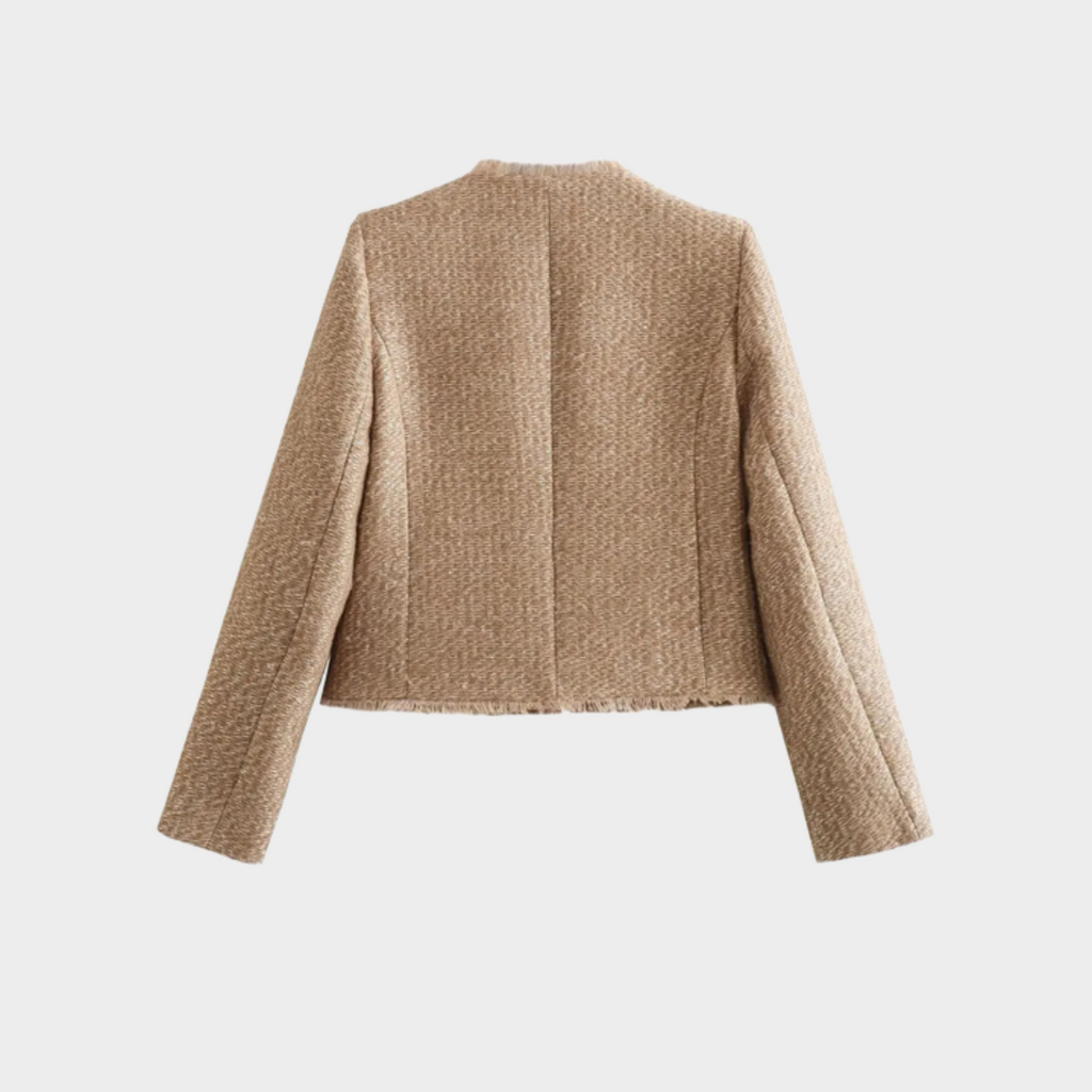 This tailored jacket presents clean lines and classic detailing, with a visible textured fabric that adds subtle visual interest. The design stays refined without extra ornamentation, making it easy to pair with different pieces in your wardrobe.